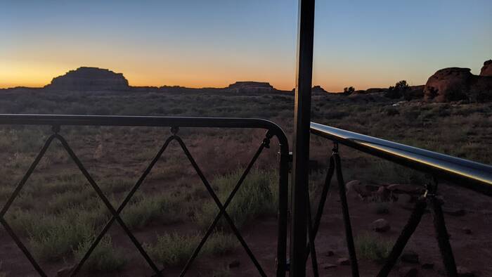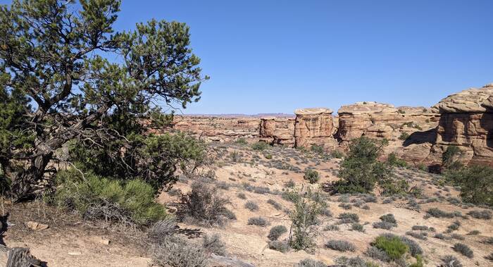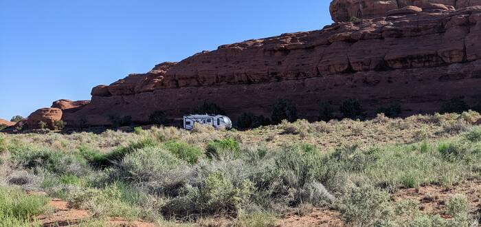 We stayed at Needles Outpost which is a little private campground adjacent to Canyonlands National Park and surrounded by other federal land. The property included a campground, a tiny general store (think ice cream and trinkets) as well as the only (expensive) gas pumps for many miles. The camp was very basic--they had no amenities, excepting a small bath house, and they trucked in water from 80 miles away. One side of our campsite was open to the desert with rock formations visible in the distance and the other side viewed a large smooth rock formation that looked like it would be fun for kids to climb on. When we arrived after 3pm it was hot (upper nineties), but it cooled down nicely in the evening. This was a very quiet campground and was fairly empty when we arrived.