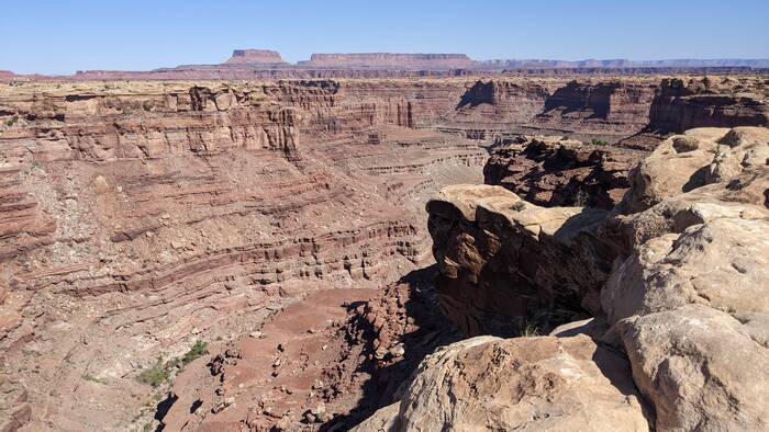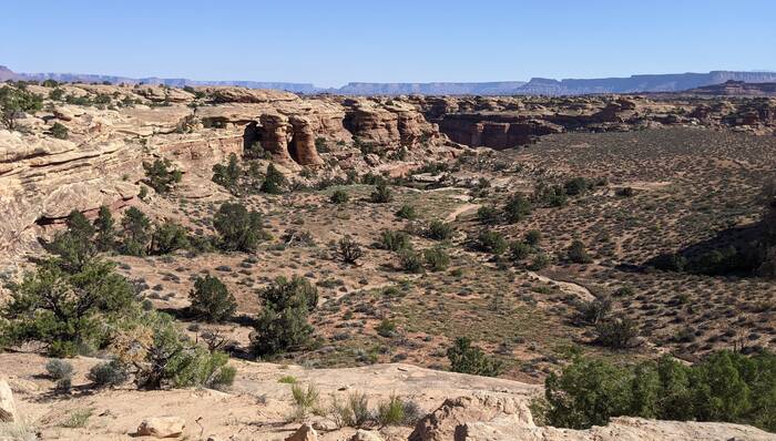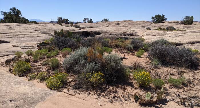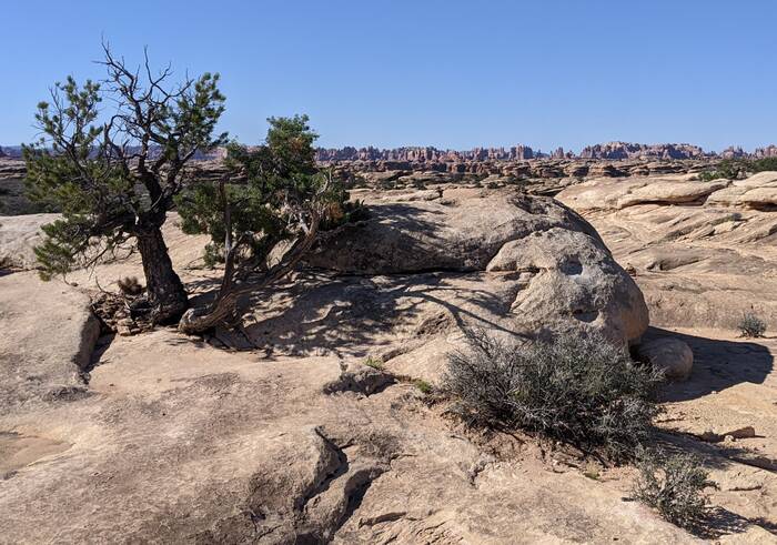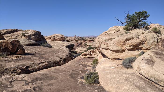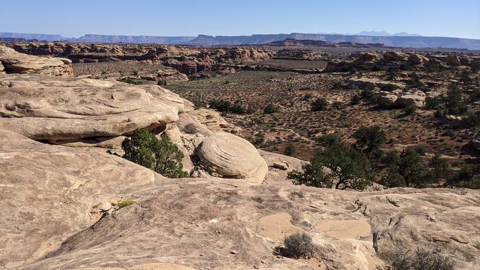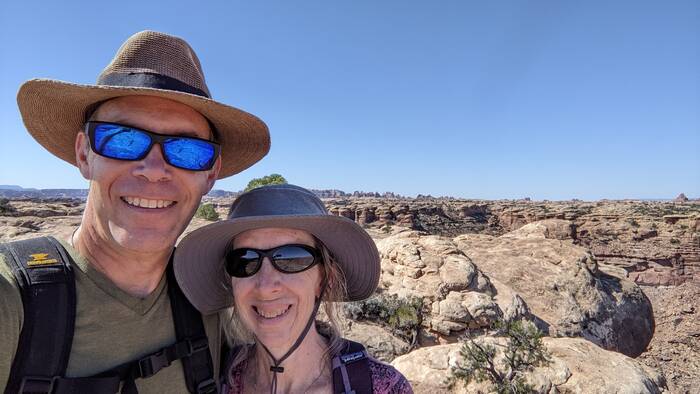 The next morning, we headed off to Canyonlands National Park where the attendant at the gate warned us to take a lot of water and be careful - forecast was for the 100s. Yikes! We chose the Slickrock hike which promised the most bang for the buck in terms of its scenery to effort ratio. It was mostly level-ish, not too long (3.2-mile lollypop), and it provided sweeping views in every direction. We really enjoyed this hike, and we finished it in time before it got too hot.