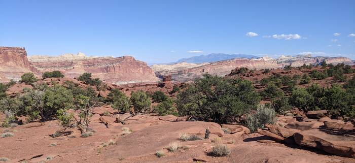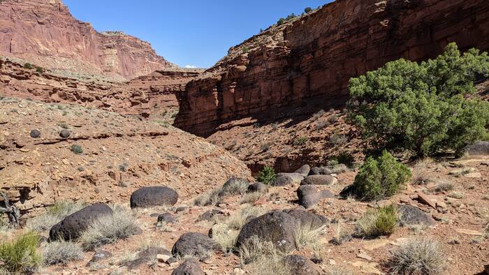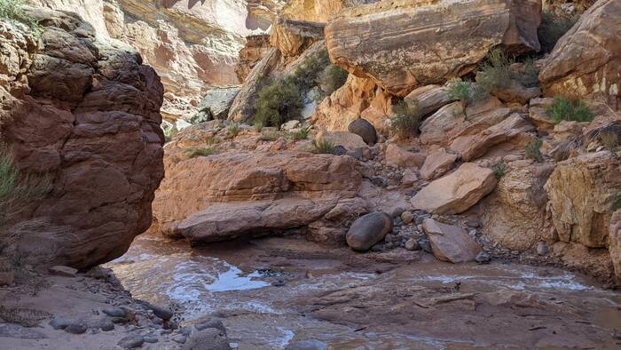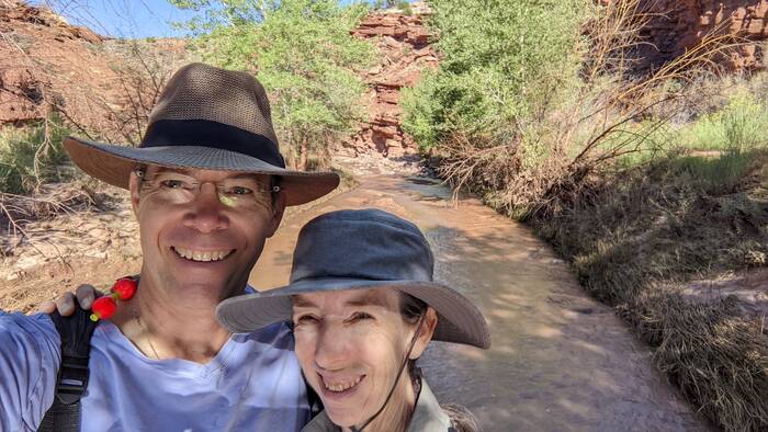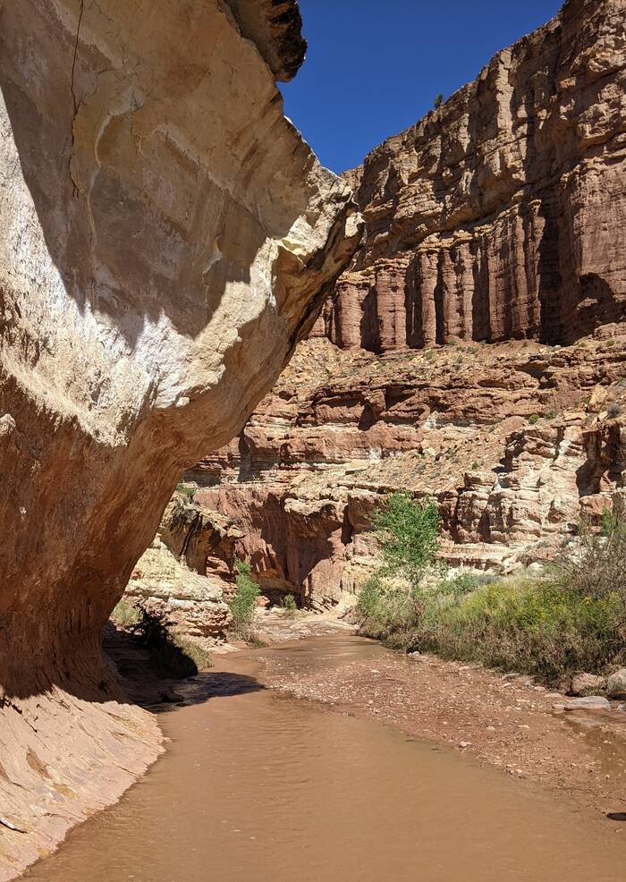 On our last day in Capitol Reef, we decided to do the "unofficial" Sulphur Creek trail. What else do you do when you want to hike, but the weather is expected to be in the mid to upper 90's? According to the national park service, it is generally recommended to hike the trail downstream (about 6 miles) and have a second car at the end to transport you back (or hitchhike or walk on the highway 3 miles uphill back to your starting point). This is not a maintained trail, and it includes wading/swimming in the narrows section (depending on water level) as well as getting yourselves past 3 waterfalls and several sketchy areas. We first thought of leaving our bikes at one of the trailheads, but decided against it because of the construction happening along the main road that involved numerous delays with lane closures and such. In the end, we decided to hike upstream (the "wrong" way) as far as we could, and then turn around and come back the way we came. This turned out to be a good choice as there was a waterfall bypass that involved some tall rock scrambling that Julie preferred not to do with her 56-year-old knees. So, that was where we decided to turn around. It was just as well, because by the end of our trek we were pretty tired, and going farther would have just made us more exhausted. Despite that, we really enjoyed this hike--it was a lot of fun!