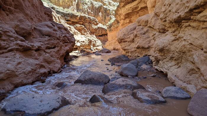 We continued upstream and had a lot of fun wading and scrambling along the route. Have to admit, though-- the silty, opaque water was slightly disconcerting, as there was no telling how deep your next step was going to be or what you would step in. Would it be friendly gravel or rock, or would it be slippery, suction-cuppy mud?