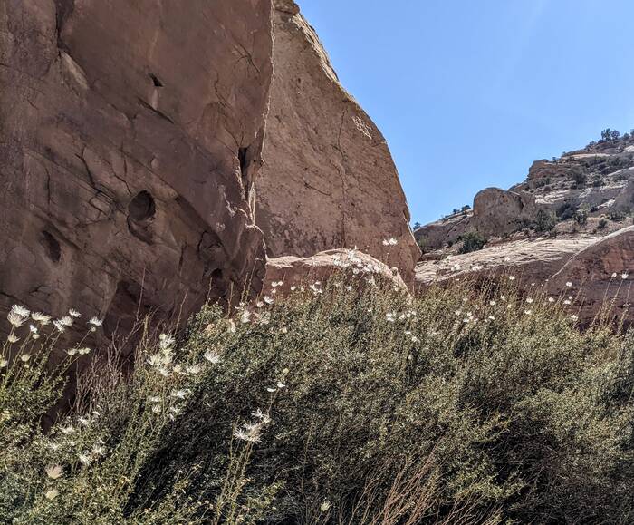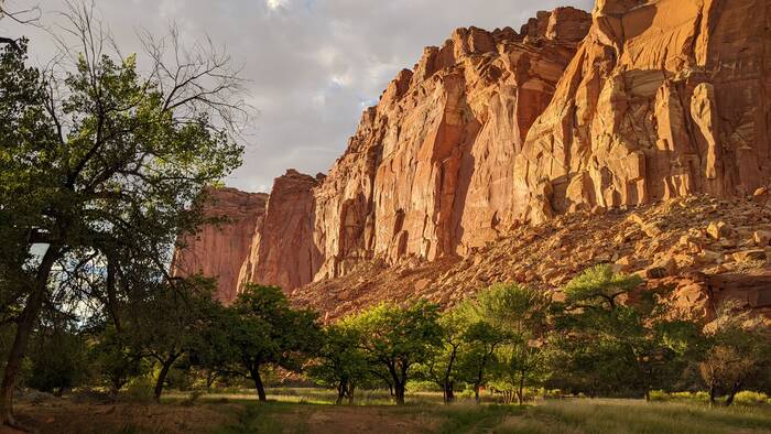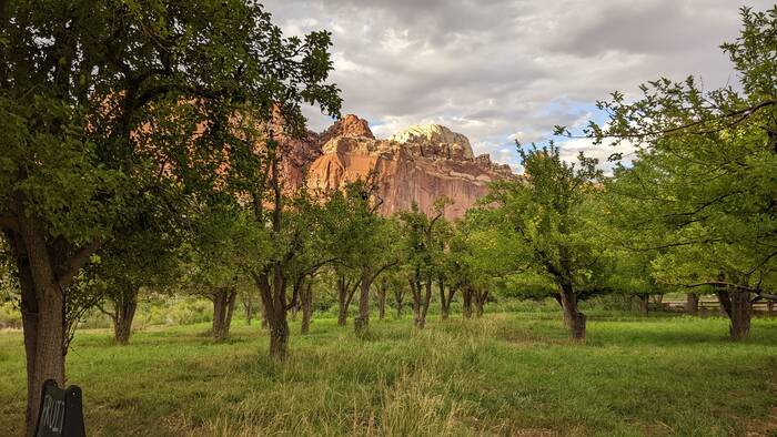 Fruita campground is located within the historic town of Fruita. It had previously been a Mormon settlement from the 1800's to as recently as the 1960's. Never having more than 10 families at any given time, the inhabitants had planted extensive orchards of apples, pears, peaches, apricots, cherries, and some nut trees. This part of Utah seemed an unlikely spot for such crops, but the river valley provided just enough water and shelter to make a go of it, albeit a difficult one for sure. The National Park Service continues to maintain the orchards, replacing dead trees as needed. When fruit is in season, you are free to enter the orchards and eat your fill (there is a small fee to take fruit out with you). Unfortunately, there was no ripe fruit when we were there.