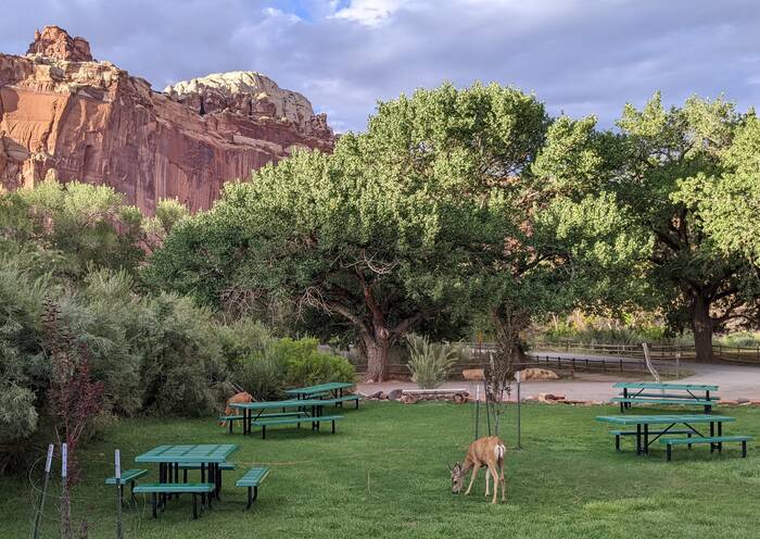 After we got setup and had dinner, we took a leisurely 1.5 mile stroll around the campground and surroundings. We walked along a pleasant path adjacent to the Fremont river that connected the campground with the visitor center and some of the historic buildings and orchards. We discovered a particularly high population of deer who did not have the slightest fear of people.