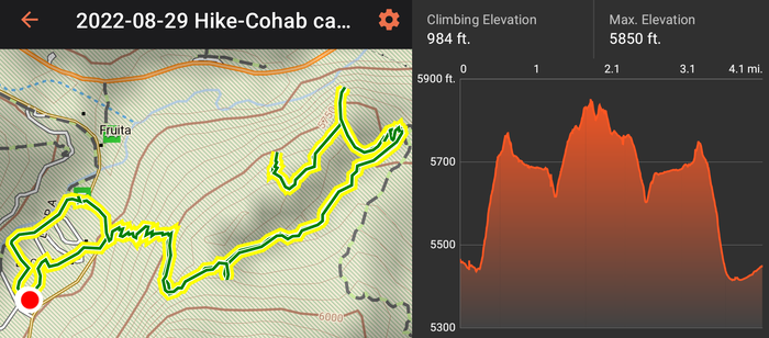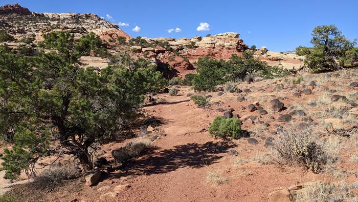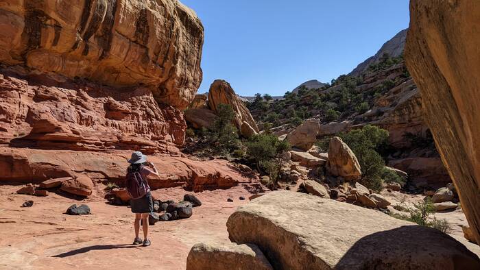 The next morning, we took the Cohab Canyon hike right off the campground. Legend says that this canyon got the name "Cohab" because the early Mormon settlers would send their extra cohabitating wives there to hide when government officials came to root out polygamists. Many do not put much credence in this legend, but the name stuck. The hike was 4.5 miles and climbed 984 feet total, and we were rewarded with a lot of varied terrain and scenery. We were glad we had started fairly early in the morning as it got pretty hot by lunch time we returned to camp. As an added bonus, we stopped at the historic Gifford House on the way back to buy two small fresh baked pies (one cherry, the other mixed berry). They were yummy!