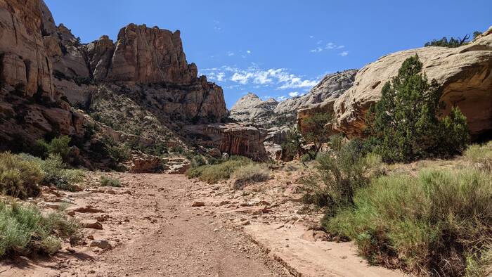 We also took another side dirt road along the wash of Capitol Gorge. It was really nice to ride our bikes rather than drive this road so that we could go slow and gawk at the views without worrying about blocking the road. Not that there was much traffic. In fact, we did not encounter a whole lot of people at all at this park during our stay. Apparently, Capitol Reef is one of the least visited of the Utah national parks.