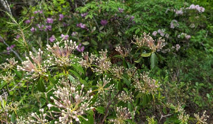 Lots of rhododendrons succumbed to the fire, but part of this one survived