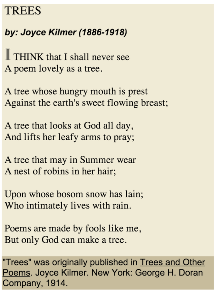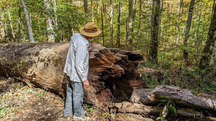 We hiked a trail (2 miles) in the Joyce Kilmer Memorial Forest in North Carolina. The forest contains many trees over 400-years-old, some more than 20 feet in circumference and 100 feet tall. The 3,800-acre forest was set aside in 1936 as a memorial to Joyce Kilmer (the author of the poem “Trees”) who was killed in action in France during World War I.