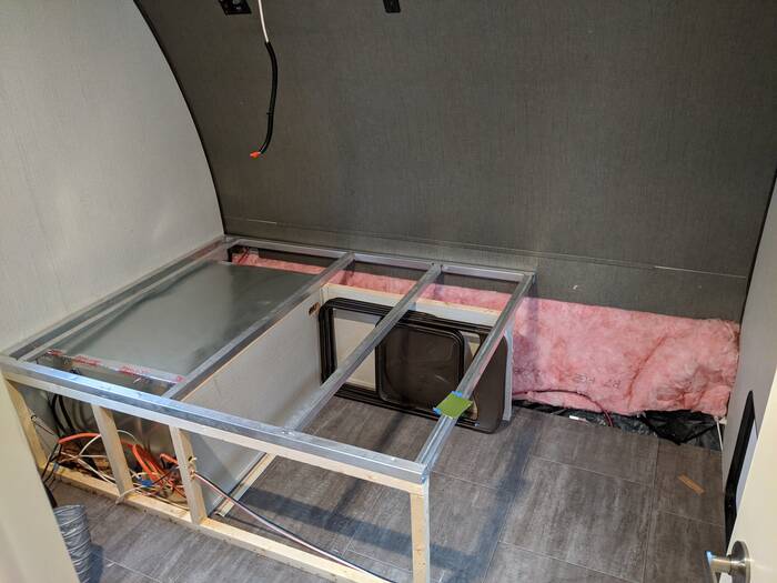 Then we kept going - taking off all the bed decking and cut the metal frame down to queen size width . . . This means that we are removing the pass through on the right side (the door is still there but will be insulated and sealed off. The pass through on the left side (the metal box on the left side) was designed for a built in generator - but we will just be using it for storage. As you can see we have removed most of the "outdoor" storage which the pass-through storage usually provides. Our plan is to use the bed of the truck for that kind of storage. The right side is getting turned into a large closet area so we will have plenty of clothing storage.