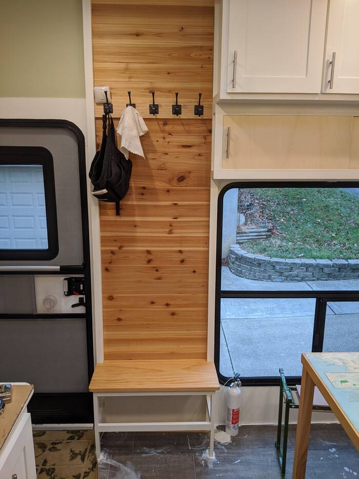 The entry coat rack and bench also came out really nice (more cedar paneling and Danish oil), although there was some drama involved in mounting the coat hooks . . . Turns out that the holes they put in are not actually square with the hook itself (or the rectangular mounting plate) . . . So first time they got mounted with the holes square . . . Much wood glue and many toothpicks later we have them mostly mounted so the hooks are vertical.
