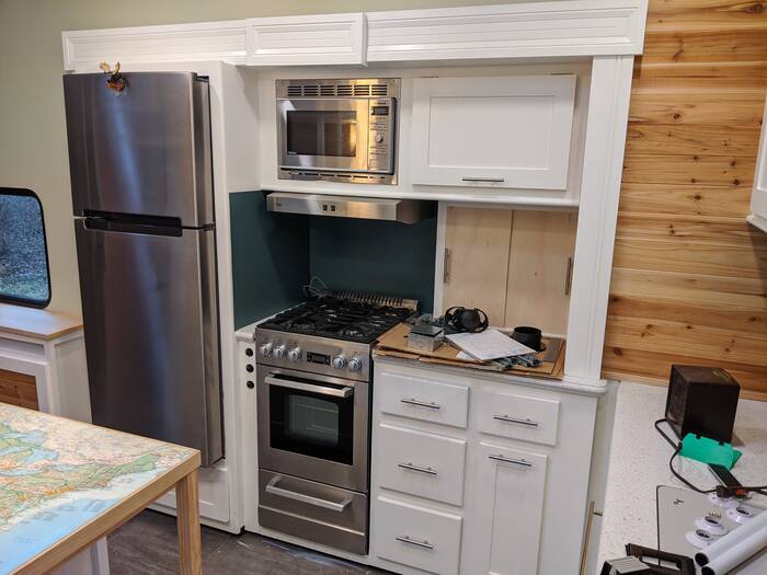 The stove area is now mostly complete with the exception of painting the sliding doors where coffee stuff and oils will probably be stored.