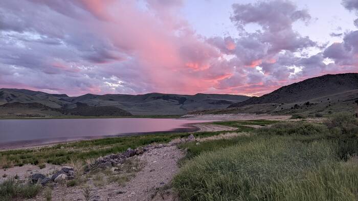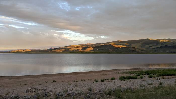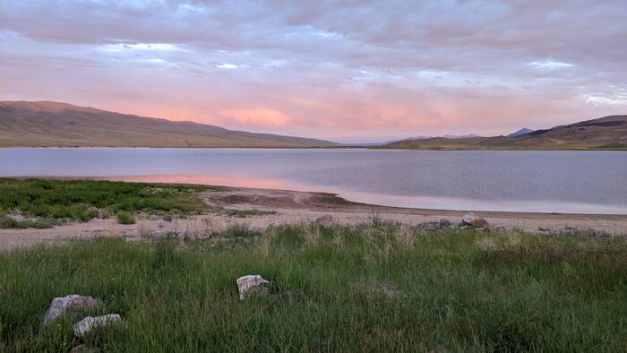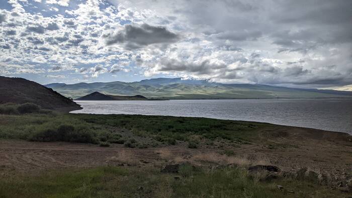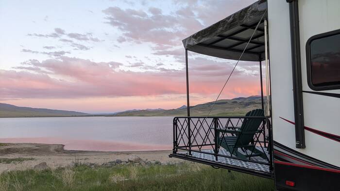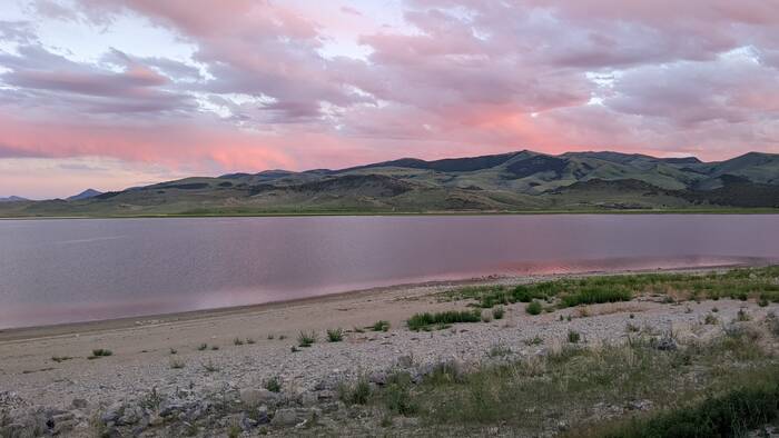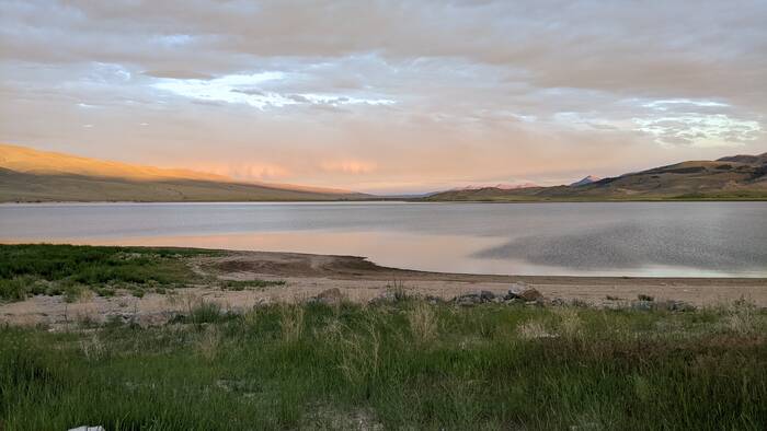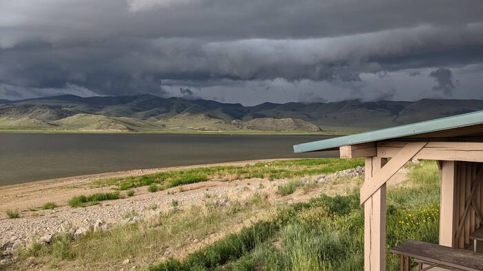 Upon arrival at Clark Canyon Reservoir, we decided to go for one of the free designated camp grounds instead of just parking randomly on the beach or along sketchy dirt roads (which is allowed here--and some did just that). After touring the first campground, we determined that we didn't like anything available and moved onto the second campground where we found a fine spot that overlooked the lake. It had a little covered shelter, but we didn't end up using it. (Just for reference, there were six free campgrounds scattered around the lake, so there was little risk of not finding a spot.) There were signs to beware of rattlesnakes, but we never saw any.