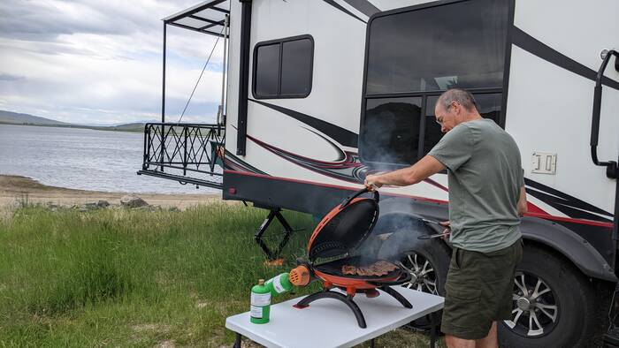 We did our own little cookout celebration on July 4th with grilled Italian sausage with peppers and onions and grilled rosemary garlic potatoes. We really enjoyed celebrating here at Clark Canyon Reservoir, although we did miss being with family and friends.