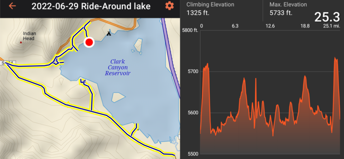Wednesday was sunny and pleasant and a good day for a bike ride around the reservoir (well - not quite all the around as there are no bike-friendly roads along one side). We went counterclockwise this day, with the intention of going the opposite direction another day. There were less gravel road spurs than we were hoping for to explore, but it still turned out to be a nice ride (a little over 25 miles).