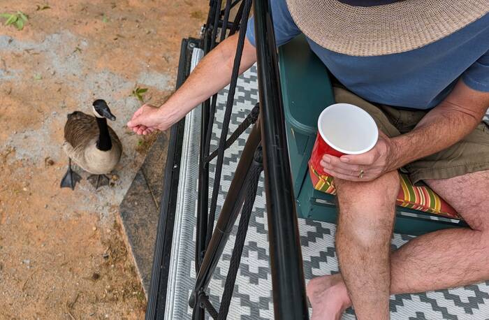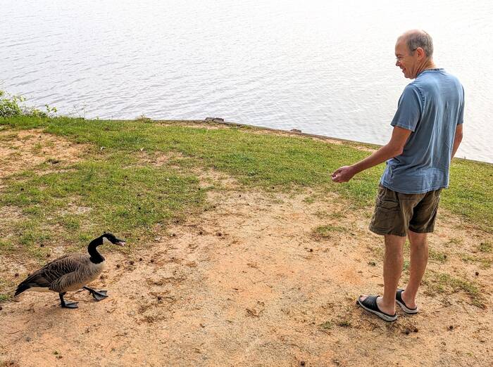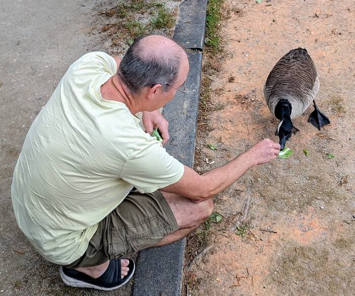 Rick didn't actually feed Gustav--he was only teasing (Yes, Rick is mean like that) (Sorry - I didn't have any goose chow handy😀 -Rick)
