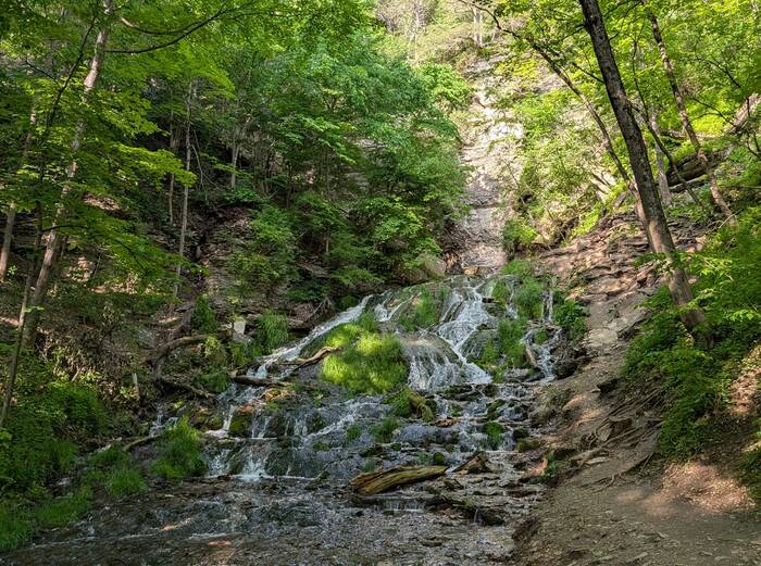 The source of the waterfall was this spring, about 200 ft high from the base of the waterfall