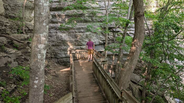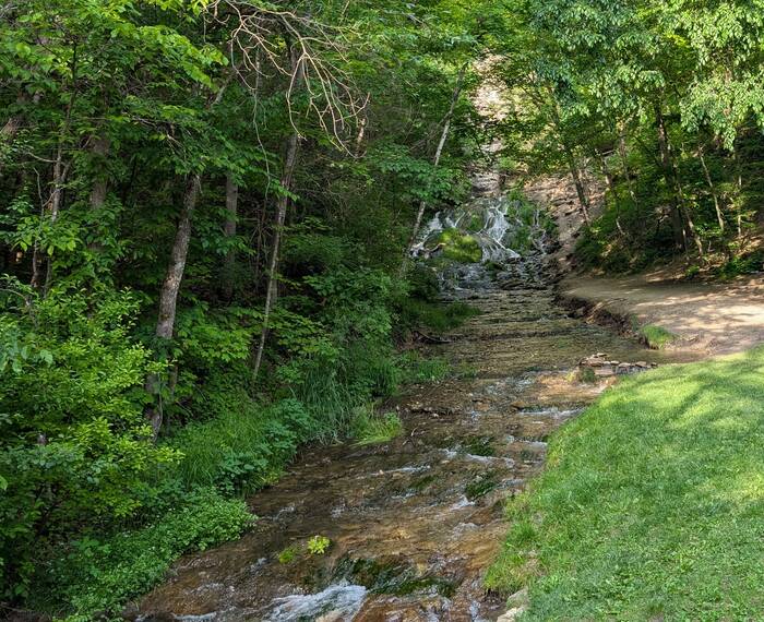 Julie was not thoroughly impressed with the aesthetics of "the fix", but she has learned flexibility in our unconventional lifestyle. So, while the epoxy was curing, we decided to resume our exploration of Decorah. We headed to the nearby Dunning's Spring Park where there was supposedly a waterfall. We weren't expecting much from a waterfall in Iowa, so we were quite surprised to find an actual, bona fide waterfall of pretty significant height.