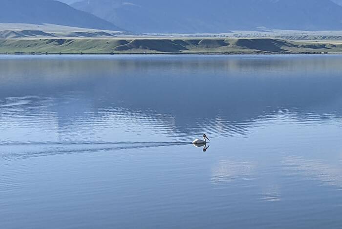 A lone pelican on a quiet morning on Lake Ennis