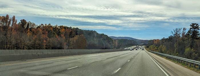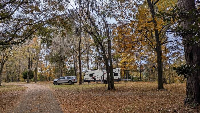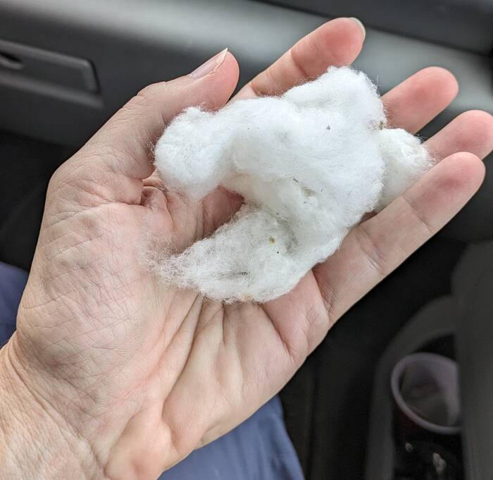 It was a pretty decent travel day with almost sunny skies as we drove through rural Alabama, passing several cotton fields along the way. Most of them looked to have been recently harvested, and we found a lot of cotton scraps at the sides of the roads. Rick stopped so that Julie could collect some.