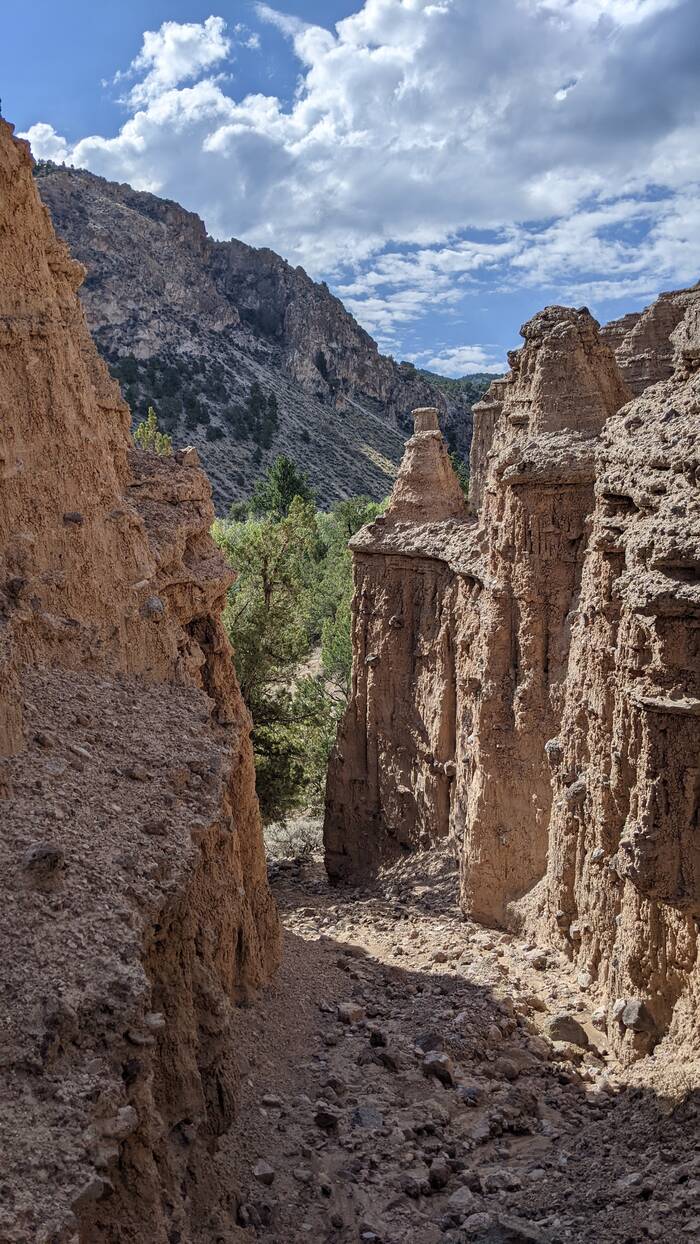What you see in these photos isn't really rock - it is more a hardened compressed muddy slurry with an assortment of rock sizes imbedded in it. We wore gloves for climbing, and as you climbed, stuff would just crumble and slide under you. You really couldn't count on things supporting your weight unless they were pretty big size rocks, so we tried to stay away from edges as much as possible.