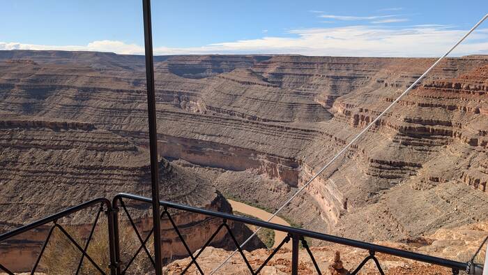 Goosenecks State Park occupies part of the "goosenecks" of the meandering San Juan river that had cut a deep canyon over time. Camping here is unique in that you pay your $10/night and then just drive along the canyon edge and find a spot to park. Rick wanted to back up right to the edge so that our deck would overhang the canyon, but Julie wasn't having any of that. We ended up compromising--we parked far enough away that we could walk comfortably around the deck and not be in immediate danger of plunging to our deaths into the San Juan, yet we were close enough to see to the bottom of the canyon from our deck. A win-win!