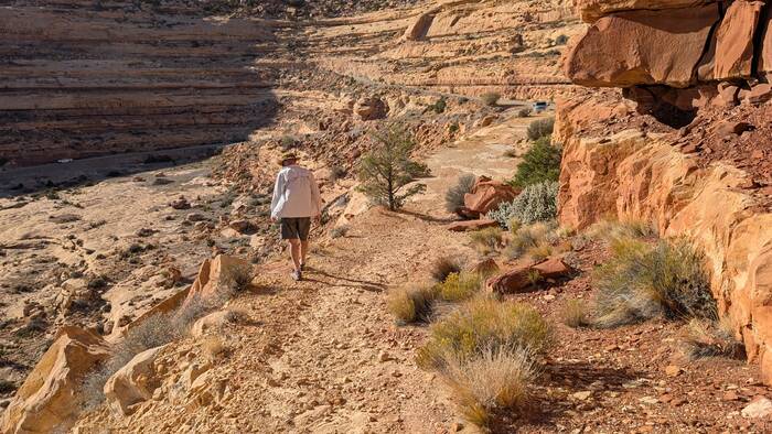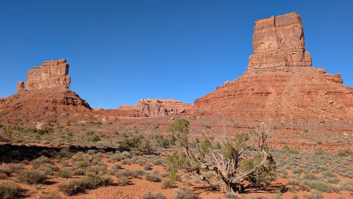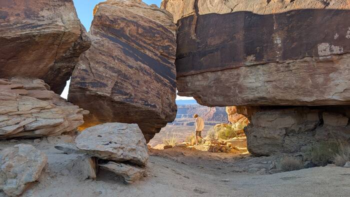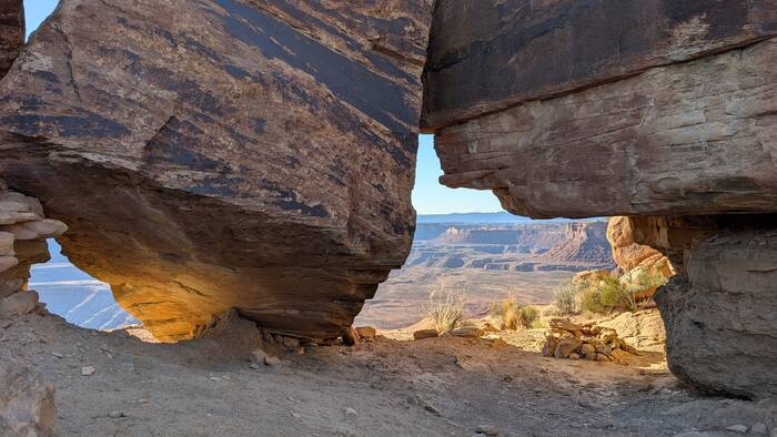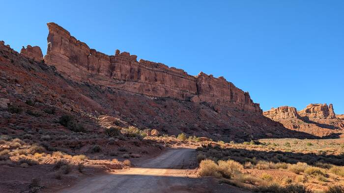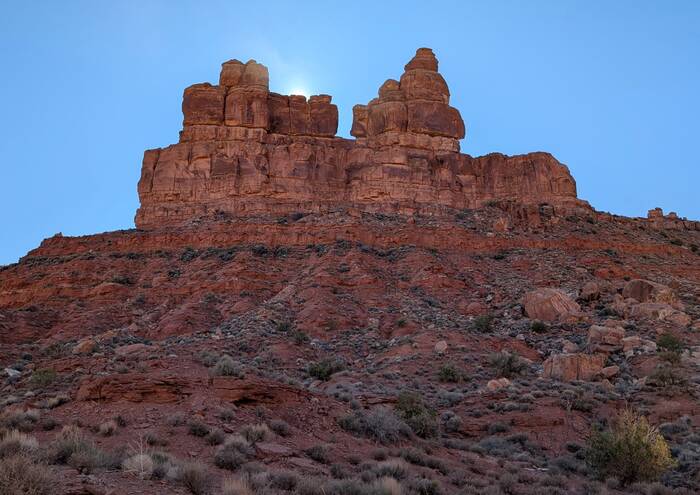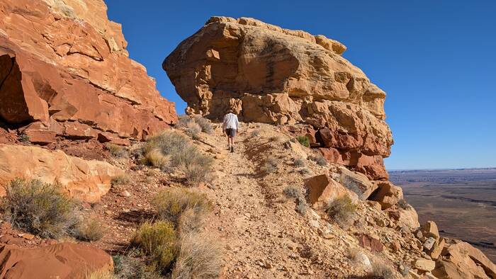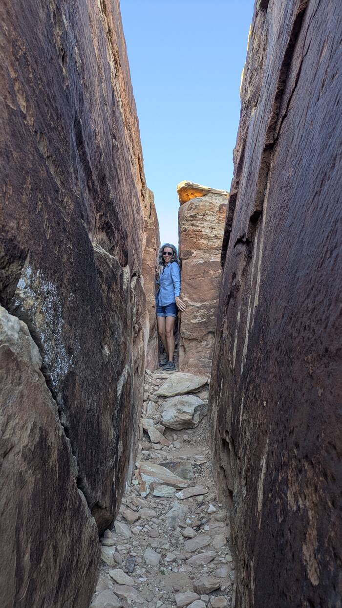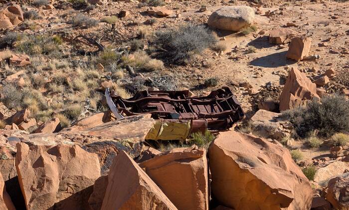 Julie tried to do an internet search to see what the deal was with this car--surely someone else had noticed it and posted something. It turns out there have been many car wrecks over time, and apparently there are other abandoned wrecked cars down the cliffs that we didn't notice, so this one probably isn't anything special. During her search, however, she did come across a highly entertaining circa 1980s story of two young guys and their misadventures in a 1959 Triumph TR-3A motorcar. If you have a few moments and you need a good chuckle to brighten your day, you can read it here: https://patrickcumby.com/finding-the-moki-dugway/ .