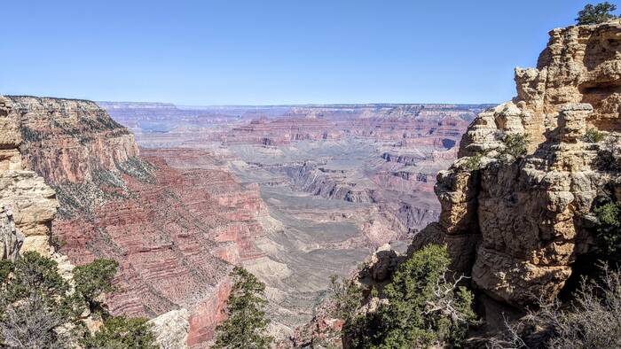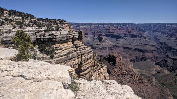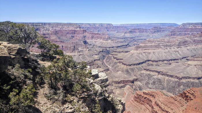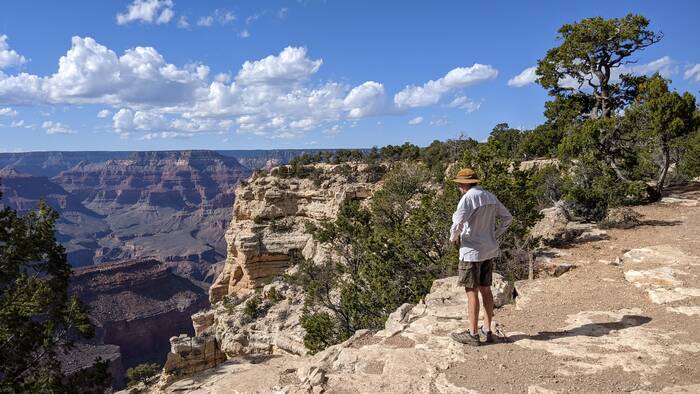 We walked along the rim toward the visitor center, but avoided the designated viewing area adjacent to the visitor center (Mather Point), as it was pretty crowded. Everywhere else was very lightly populated, and at times it felt like we had the entire park to ourselves.