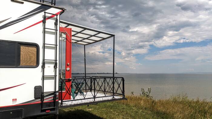 Thursday was a warm sunny day, with a pleasant afternoon breeze off the lake. We basically just putzed around the camper and enjoyed our surroundings. Rick lubricated the slide (which had been making some scary noises lately), repaired some broken tie-wraps, and made bread, while Julie coated the screens and sprayed the deck rug with permethrin in the hopes of discouraging the insect life from hanging around too close to us. We also spent a good amount of time trying to decide if we wanted to keep with our original plan and stay at this campsite for 3 nights (and drive almost 7 hours to the next destination) or leave after 2 nights and find another place to stay so as to break up the drive. In the end, Rick decided he was okay with the long drive, so we stayed at our lakeside site until Saturday morning.