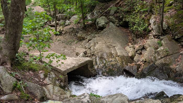 The concrete water diverter in Gee Creek was used to wash mined silica, which provided flux for furnaces processing copper. The mining occurred around the 1890s when the railroad provided a new option to access the Copper Basin in addition to the Copper Road (now US Highway 64).