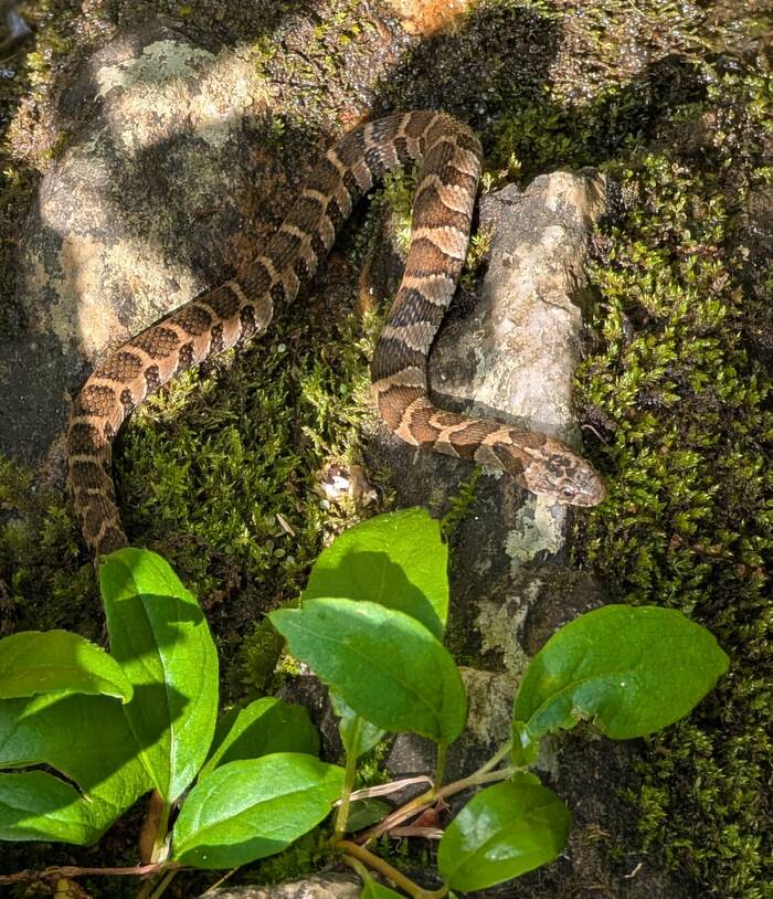 This guy was sunbathing on a rock that Rick was climbing. Both Rick and the snake were quite startled. Turns out, it was just a harmless common water snake.