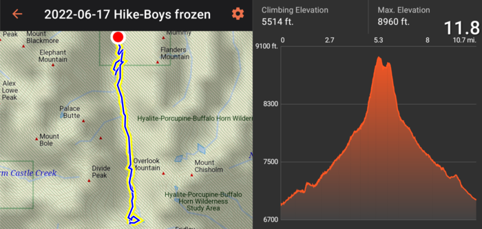 We hiked from our campsite. Ignore the straight line on the left (and add an extra 1/2 mile for it) - Rick messed up the GPS and it wasn't recording . .