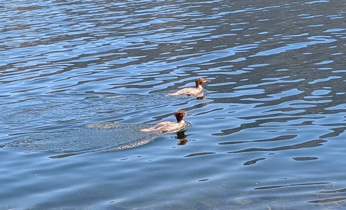 Meanwhile, a group of common mergansers swam by (most of them were underwater at any given time), but they didn't stop for a visit.