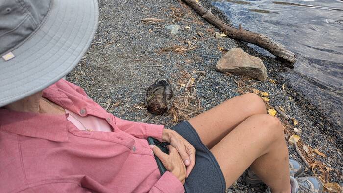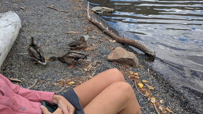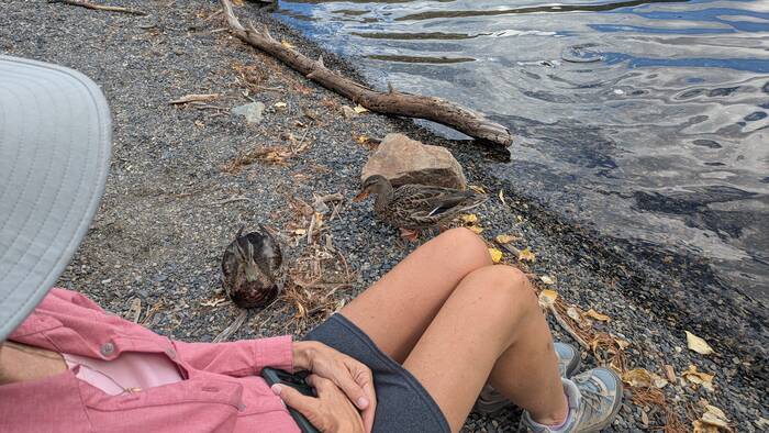 As we were sitting by the lake, a lone duck walked up to us, clearly expecting handouts.