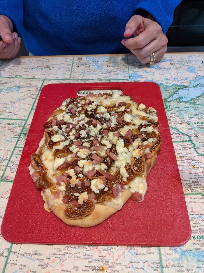 We winged a fig-blue cheese-proscuitto flatbread for dinner--and it turned out pretty good!