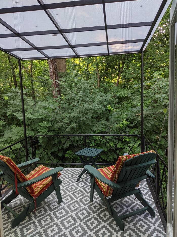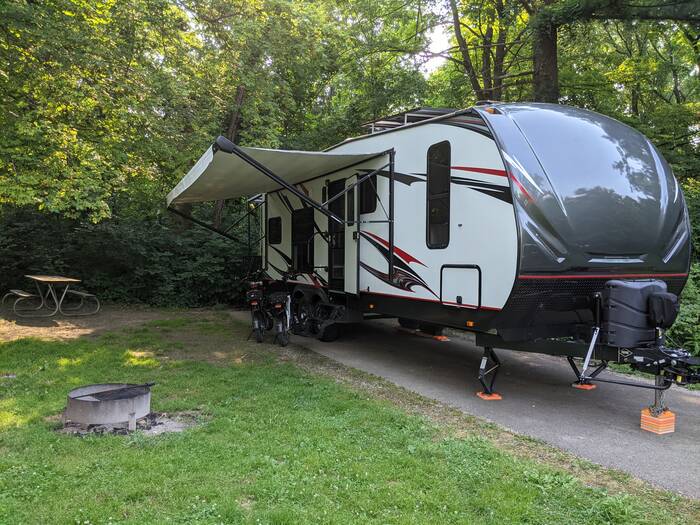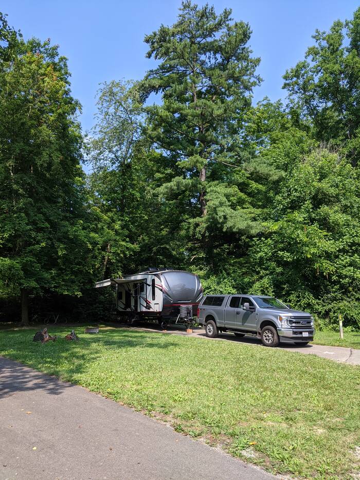 Here we are at site #25. It was shady in back for the deck, but sunny-ish in front, so we were able to get decent solar. Being that this was an electric site, we could have hooked up to power, but we are spending this summer learning what our solar capabilities are in various circumstances.