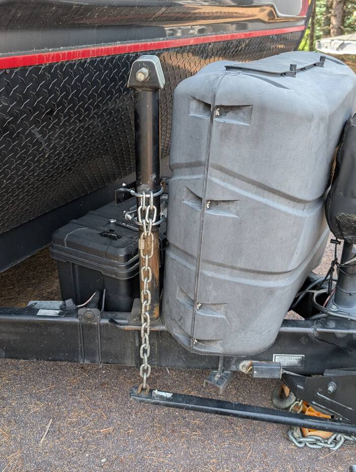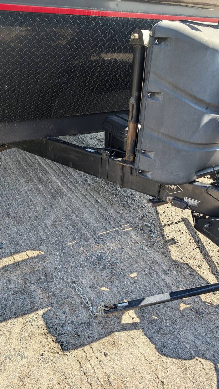 The next day, Rick implemented a fix to the hitch weight distribution bar support that did not involve rope or tie wraps. We won't know how well it will hold until we drive with it, but it looks more "legit" than the previous solution.