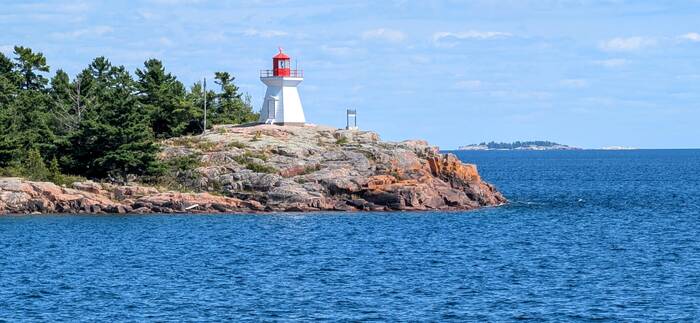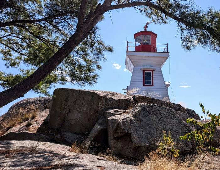 The sign has suffered the wrath of time and weather, but it reads in both English and French, "Killarney Lightstation" (along with a bunch of graffiti)