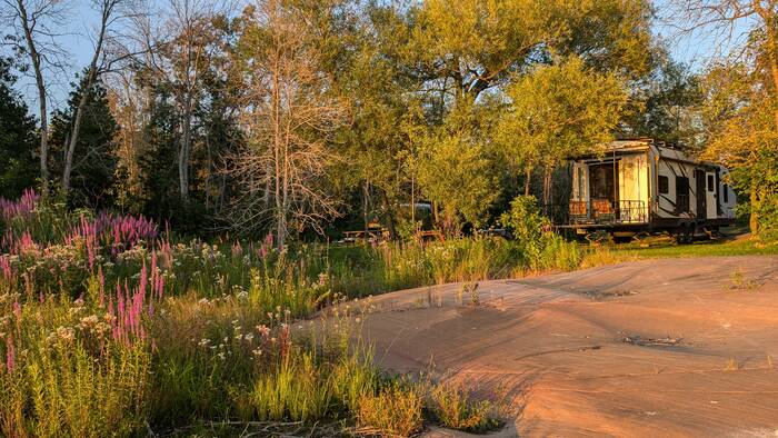 The next day brought more beautiful weather, and we lost track of time just sitting on the deck enjoying the view until mid-afternoon. We finally motivated ourselves to take a walk around the campground to explore the tent section. It turned out to be a fun and more adventurous outing than we expected. We discovered a boat dock and a scenic water access that wasn't shown on the campground map (located near the "soft do not drive here" section on the map--a place that looks like people drive there anyway to put their boats in 😲). We also found remnants of trails and got the impression that perhaps this property had been more developed at some point in the past.