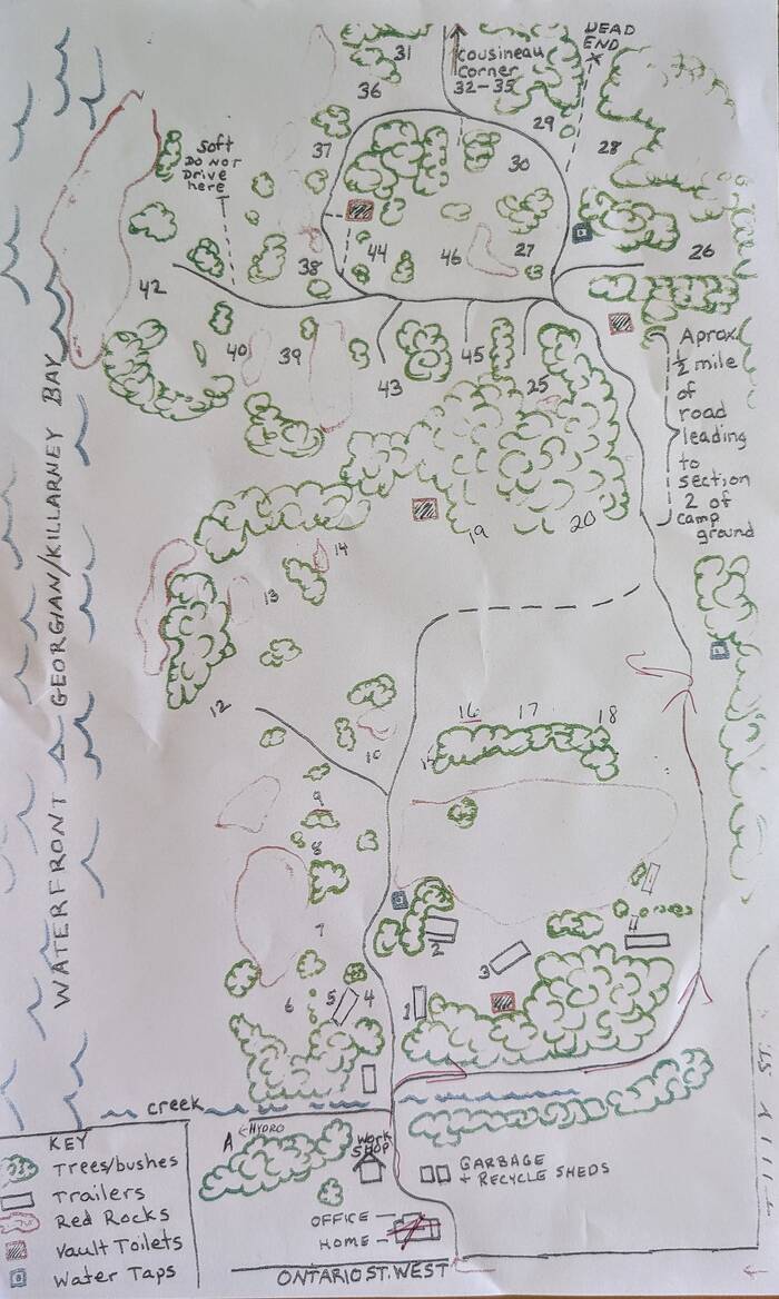 The quaint map drawn up by the campground owners--more of an allegory than a strict representation of reality (We were in site 9, by the way)