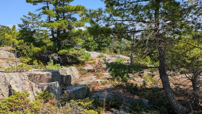 This trail continued to dish up a little bit of everything. When we got to the end of the lake, we had to traverse some quite swampy / buggy sections to get back to the Georgian Bay coast. From this point on, the trail whereabouts became anybody's guess. Every so often, a hopeful suggestion of the trail was offered by a smattering of trail tags and orange flags on trees, if you were lucky enough to notice them. Several sections would have been quite hard (almost impossible) to follow without the use of the GPS map.
