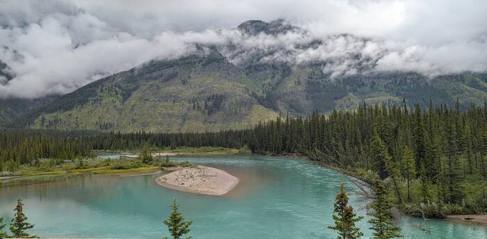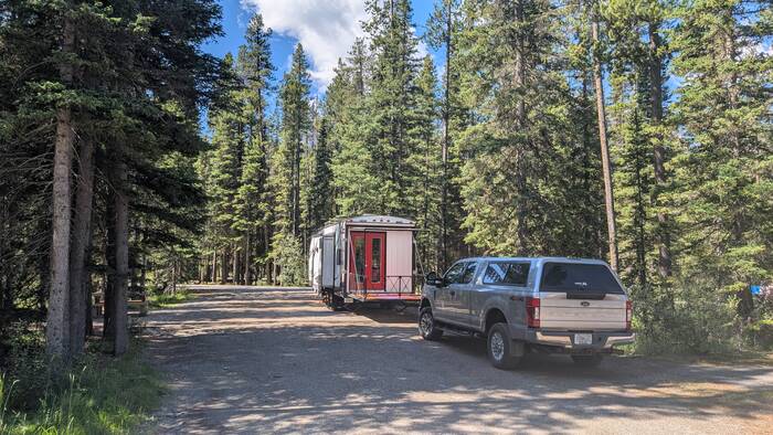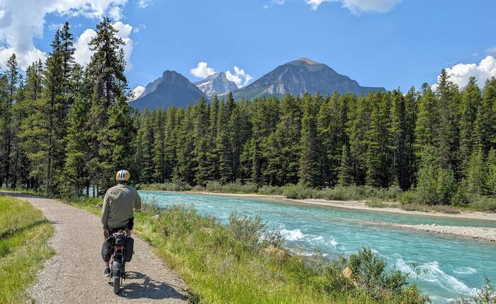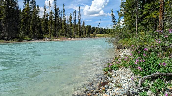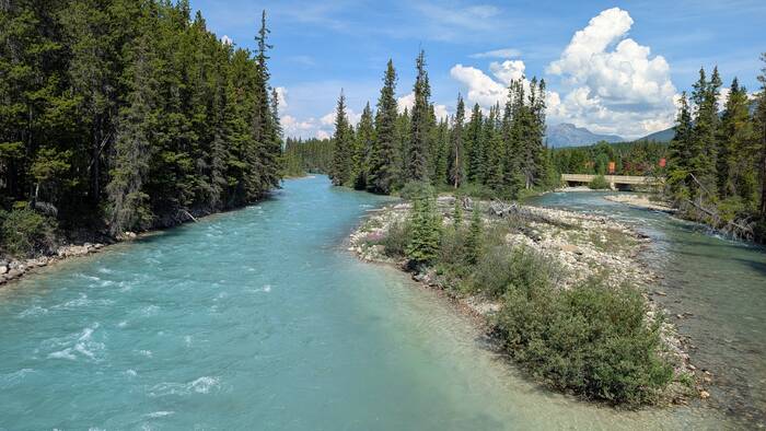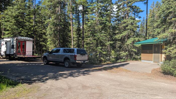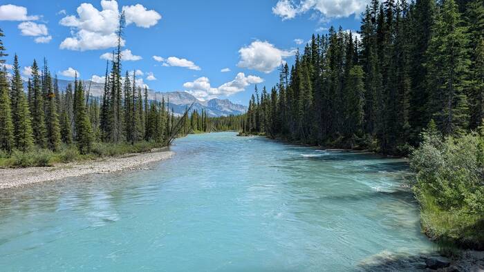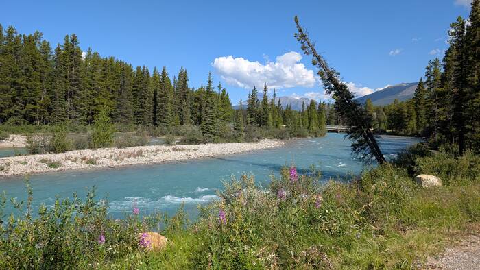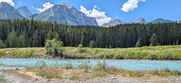 Rick started coming down with whatever we got (most likely flu or COVID) on Sunday night while we were still in Banff (thankfully after the kids had left and after laundry, shopping, and putting everything away). It started out as a slight scratchy throat, and we didn't think much about it. After traveling about an hour to the Lake Louise campground and setting up at the new campsite, Rick was exhausted and took a long nap that afternoon. The next morning, he never got out of bed. He barely got out of bed on Wednesday, either. During this time, Julie was feeling mostly fine, but she had a very slight tickle in the throat from time to time. The weather these days was gorgeous, so Julie would go out and walk the nearby trail along the Bow River and take a chair to read by the water for a couple hours each day. The campground and surroundings were quite beautiful.