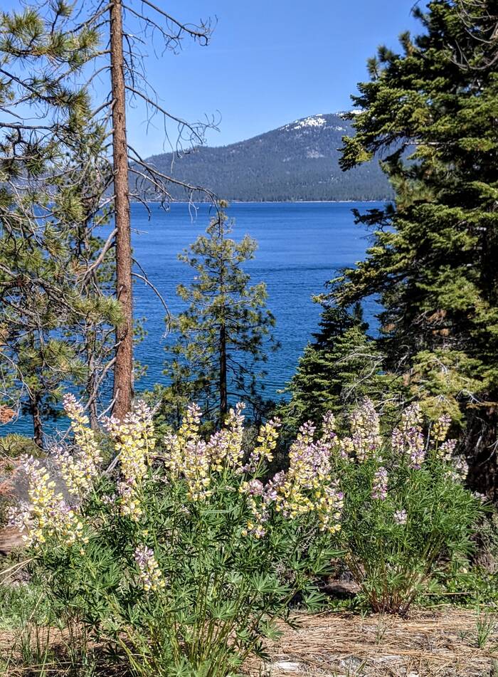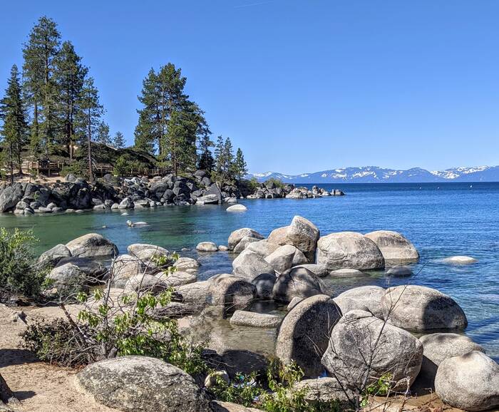 On Saturday, we did the grand tour of Lake Tahoe, with Maura acting as our tour guide. She had previously cycled the 75-mile road that encircles the lake, so she knew all the best spots. Our first stop was Sand Harbor State Park in Nevada. We got there mid-morning when it was still a bit chilly, but there were plenty of people in bathing suits swimming in the frigid water.