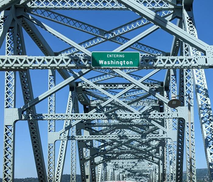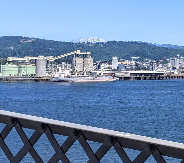 Mt. Saint Helens in the distance while crossing the bridge over the Columbia River
