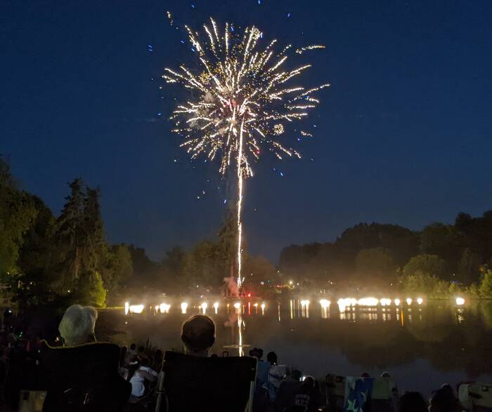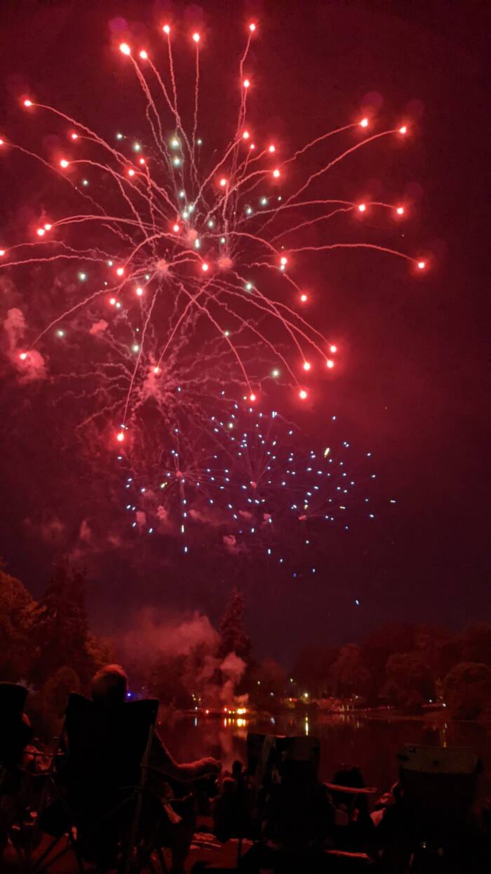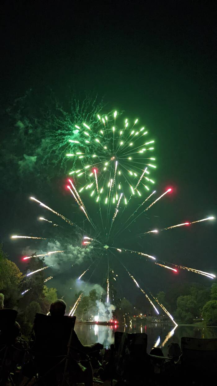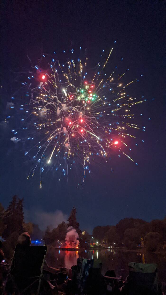There seemed to have been some kind of miscommunication between the pyrotechnician and the festival organizers, as the piped-in patriotic music ended well before the firework display was finished. No matter, they were just as enjoyable "au naturel". However, the ending was a little awkward, as there was more a sputtering slow-down rather than an exciting grand finale. After there was no firework set off for about 10 seconds, a few people started quietly cheering. Then another firework went off. After another 10 seconds, the announcer came on to thank everyone for attending. As people started to leave, a couple more leftover fireworks were shot off. Kind of weird.