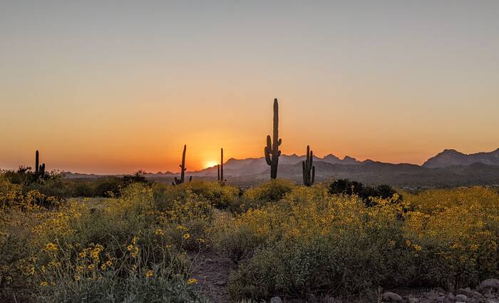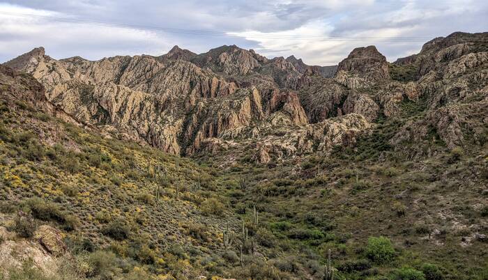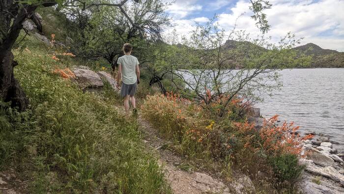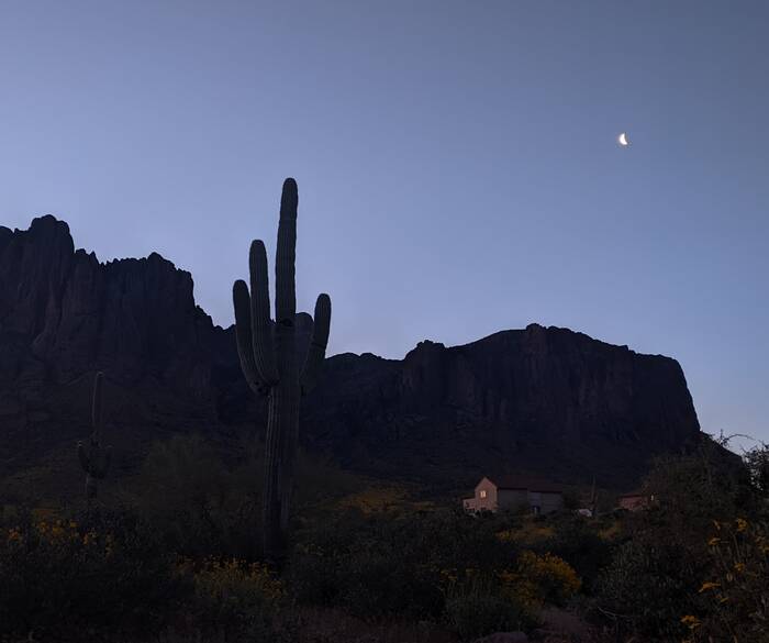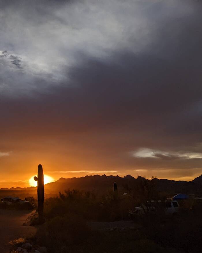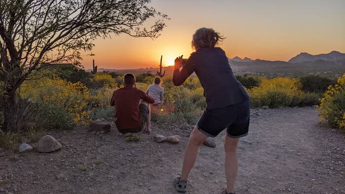 The following day, we picked up the kids from the Phoenix airport. After a brief stop at the camper, we headed out for a drive on the Apache Trail to Canyon Lake for a picnic dinner. We had high hopes of catching an epic sunset, but unfortunately it turned out to be mostly cloudy, so there was no epic to be had. The scenery was still nice, though.