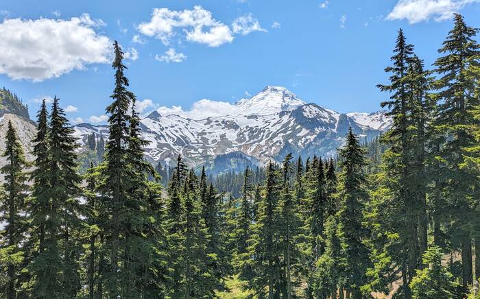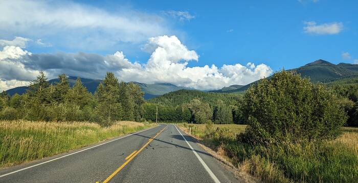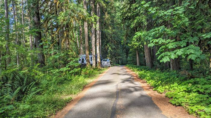 Northward we drove, almost to Canada, before turning east to enter Baker-Snoqualmie National Forest in the North Cascade Mountain Range of Washington. We took our time driving and made a long stop at a Walmart to do some grocery shopping and sit in the parking lot to soak in some solar to recharge our batteries. They almost made it to 100%, but not quite. We also picked up a new phone for Julie at an Amazon box along the route (yay!). Once we got past the Seattle Metro area, the scenery was quite bucolic.