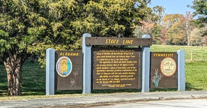 Sorry about the motion blur. The sign says something about King Charles and the separation of North and South Carolina, blah, blah, blah, and something about Tennessee and Andrew Jackson and maybe Alabama somewhere in there.