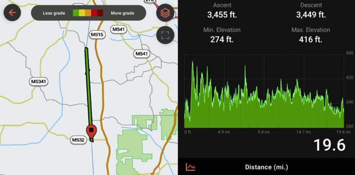 The battery on the GPS was dead, so Rick used a phone app to capture our exciting ride! The altitude information seems a bit messed up after the import😲
