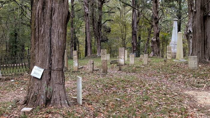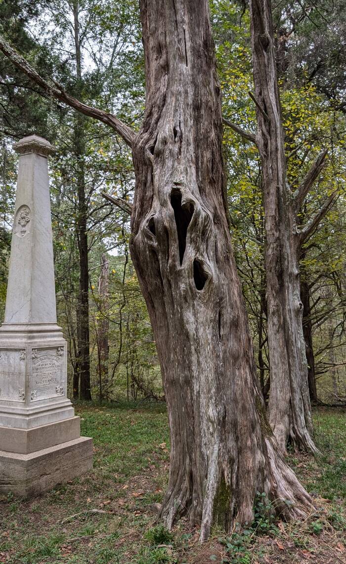 The old cemetery behind the church. There really were bees in the old tree on the left!