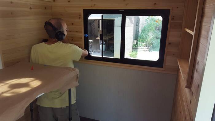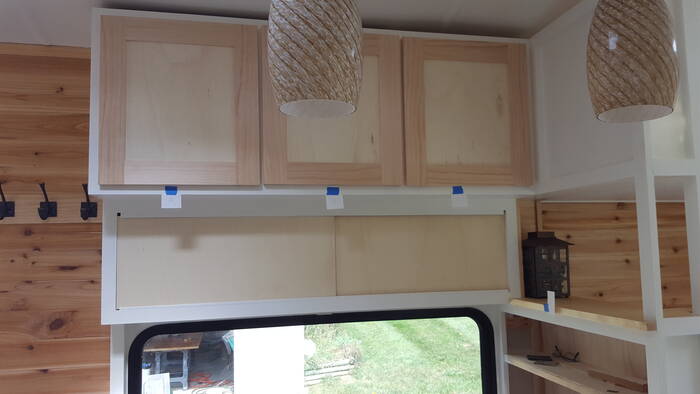 Cabinets are finally getting covered with doors, both the sliding doors and doors with hinges. The cabinet doors are made from 1x3 pine with 1/4 inch grooves cut into them to hold 1/4 inch plywood and everything is held together with pocket screws (my new favorite fasteners).