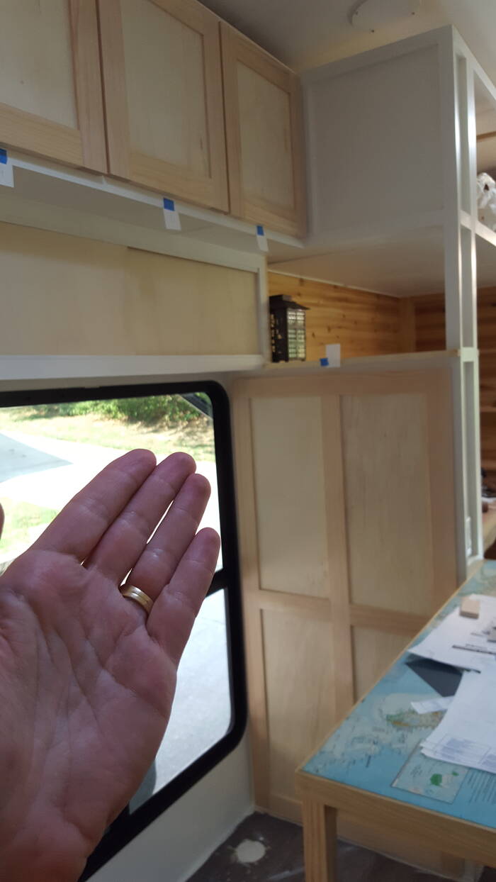 The peninsula for the kitchen is made up of plywood and wood trim with a big US map inset into it with layers and layers of polyurethane covering it all . . . we found out it is really hard to fill in cracks around the map and get everything smooth . . . more sanding . . more layers . . .
