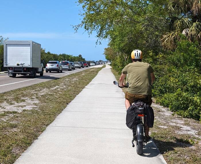 We were making better time to the island on our bikes than the cars were on the road